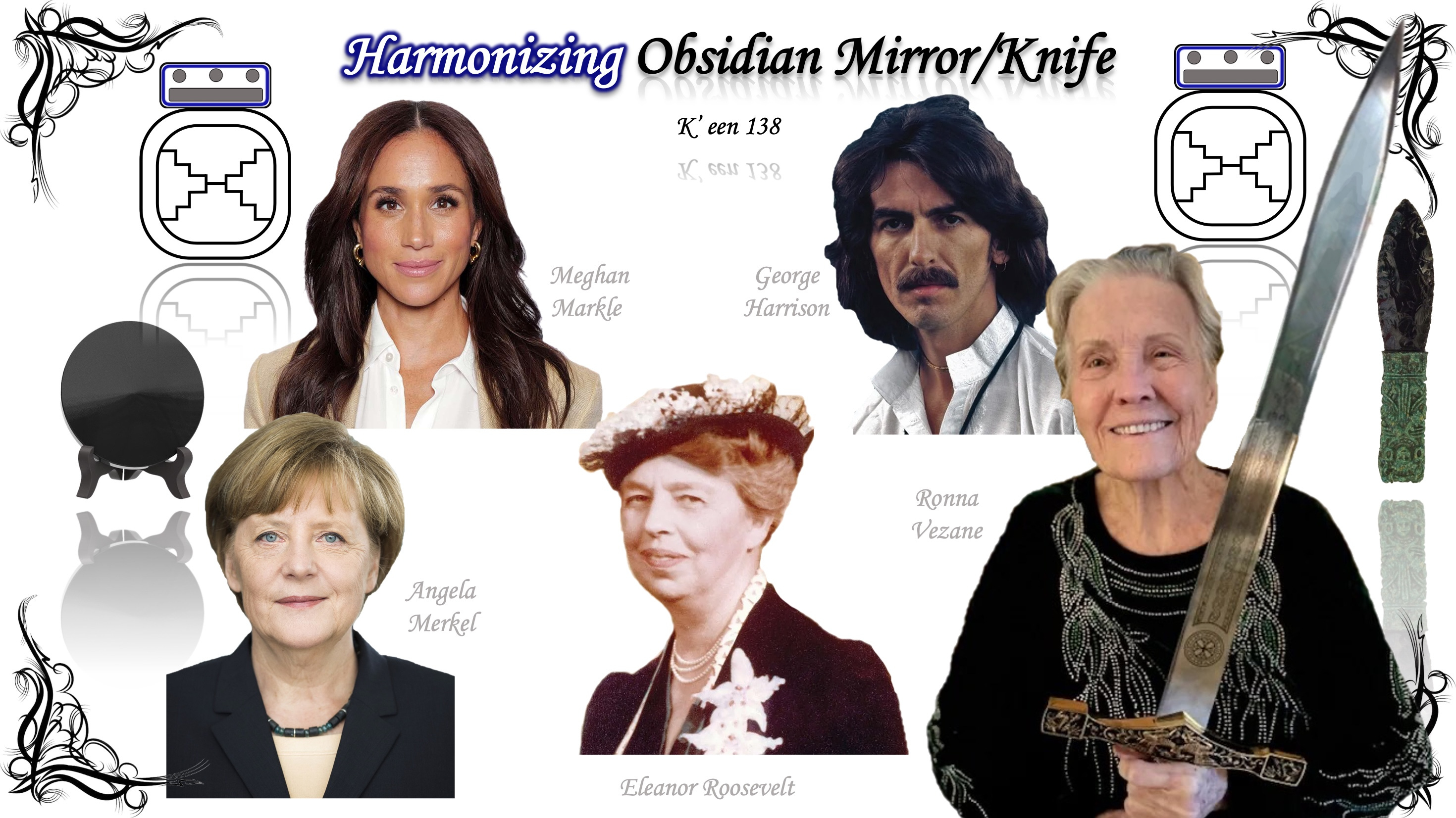All Etznab K’ een have Death and Rebirth as their FVG, don’tcha know?!?! Mos def why the Knife is used without fear in the best of cases, and when you combine that with Tone 3, with its focus on femininity and the kitchen and communicaiton and humor, we’ve got an interesting twist to the way Harmonizing Obisidian Mirror/Knife plays out its movie of life. All things are possible. As they are for every K’ een…