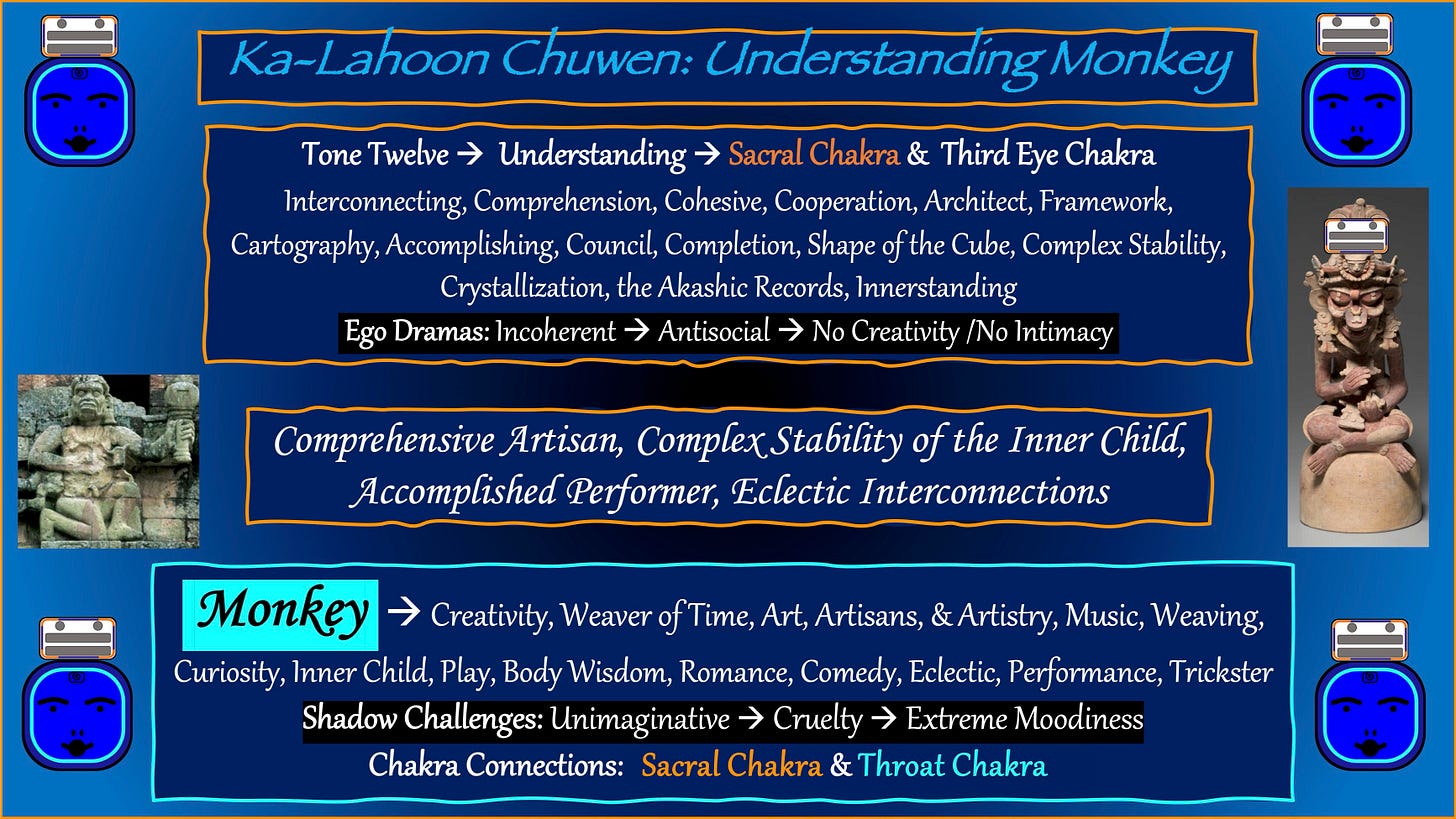 Yet the Shadow Ego distorts this energy when the Monkey’s creativity becomes blocked or weaponized. Tone Twelve’s Ego Dramas can appear as incoherence, antisocial withdrawal, or the painful sense of having no creativity and no intimacy. When the Trickster falls into shadow, the playful artist becomes extremely moody, cruel, or unimaginative. Instead of weaving connection, the shadow version tangles threads and fractures the web of cooperation. The council that should foster cooperation becomes a kangaroo court of judgment, and curiosity collapses into cynicism. On days like this, the work is to remember that creativity is not a luxury — it is a fundamental function of the soul. When we play, create, and explore, we restore the flow of consciousness itself.
