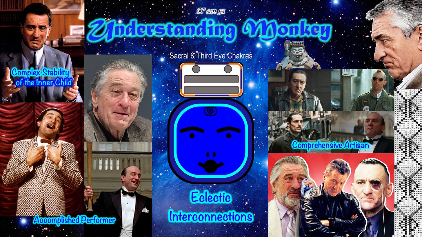 Robert De Niro embodies Understanding Monkey through his extraordinary artistry as an actor, a true Weaver of Time who disappears into characters across genres ranging from intense drama to comedy. His performances in films like Taxi Driver, Raging Bull, and The Godfather Part II demonstrate the Monkey’s mastery of performance and craftsmanship, while his later comedic roles show the Trickster’s playful versatility. Over decades, De Niro has woven together a cohesive body of artistic work that reveals the complexity of the human psyche, reflecting Tone Twelve’s capacity for deep comprehension and crystallization of experience.